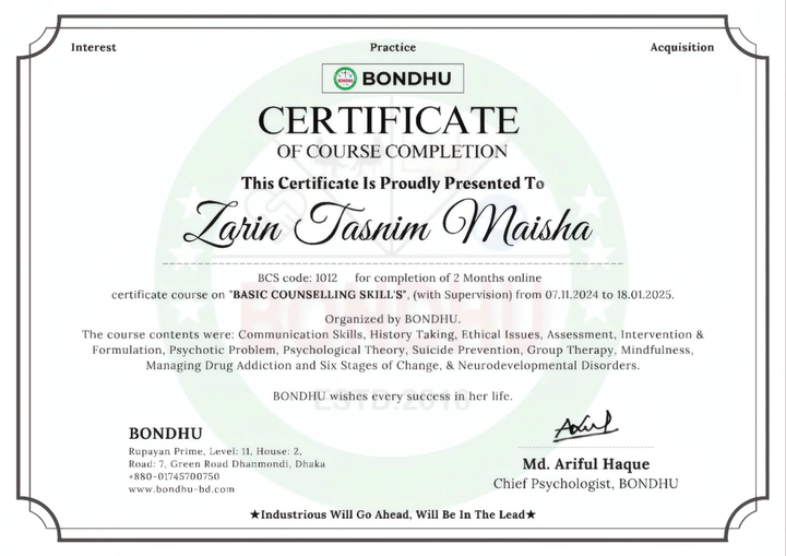Successful completion of this training demonstrates acquired expertise in basic counselling principles, thereby enhancing professional capabilities in roles that require interpersonal communication, empathetic understanding, and problem-solving skills. This certification signifies a commitment to ongoing professional development and the readiness to apply learned skills in various professional settings, in accordance with BONDHU’s mission to promote psychological health.